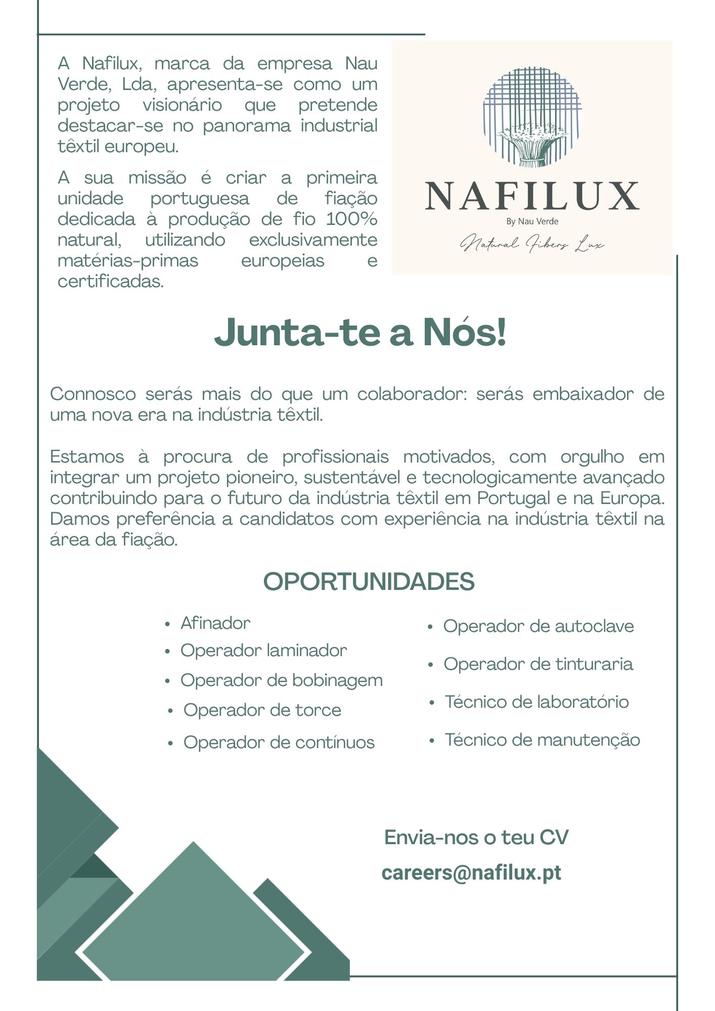 A Junta de Freguesia numa parceria de ajuda com a Nafilux, marca da empresa Nau Verde, Lda (Antiga Fábrica Nova do Gonçalves – Riopele) informa que a Empresa está neste momento em processo de recrutamento de profissionais motivados, com orgulho em integrar um projeto pioneiro, sustentável e tecnologicamente avançado contribuindo para o futuro da indústria têxtil em Portugal e na Europa. A preferência será para candidatos com experiência na indústria têxtil na área da fiação.
